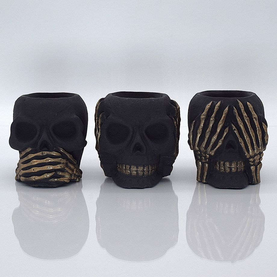 Стильный набор из трех декоративных черепов, символизирующих известный принцип: «не вижу зла, не слышу зла, не говорю зла». Иногда мудрость заключается в том, чтобы отстраниться от негатива, суеты и злословия.