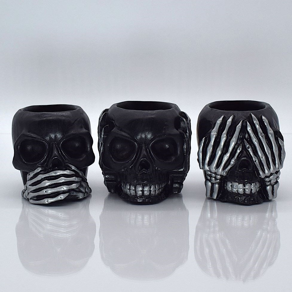 Стильный набор из трех декоративных черепов, символизирующих известный принцип: «не вижу зла, не слышу зла, не говорю зла». Иногда мудрость заключается в том, чтобы отстраниться от негатива, суеты и злословия.