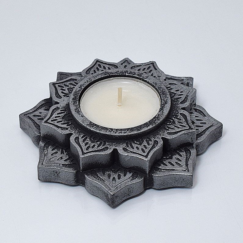 Подсвечник "Лотос 2" выполнен в форме изящного цветка, напоминающего лотос или солнечную мандалу. Его поверхность украшена орнаментальными узорами, которые придают изделию восточный колорит. Подсвечник с эффектом античного серебра, создает ощущение антикварности и благородства.