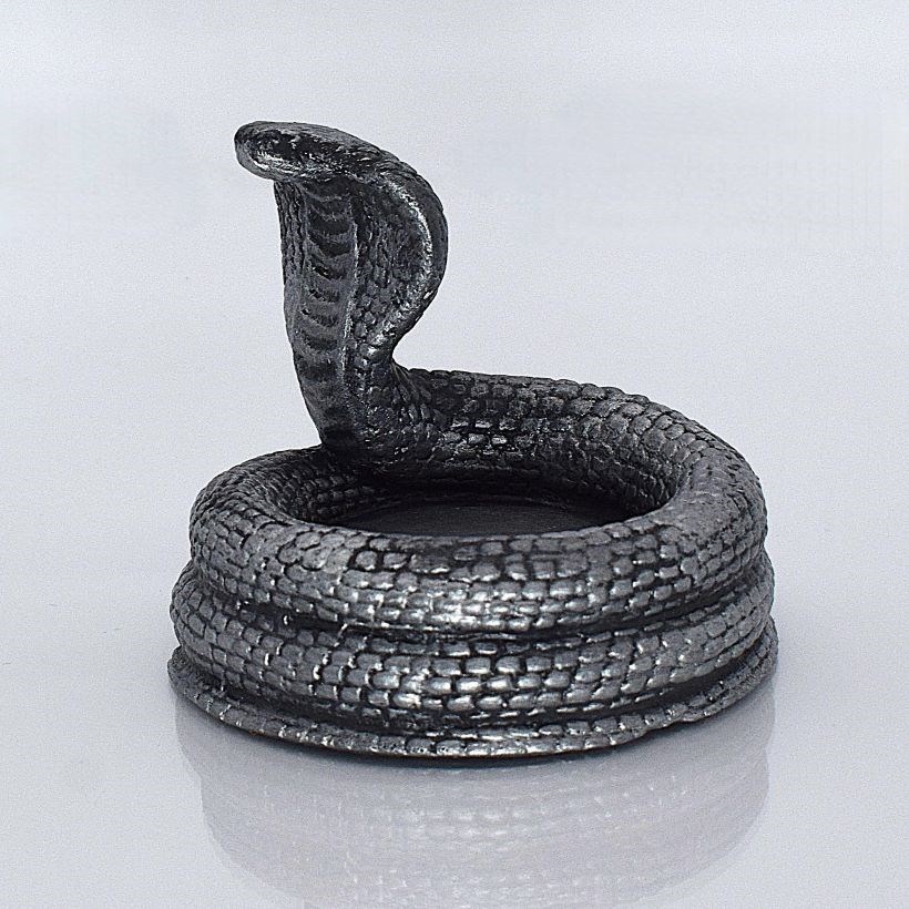 Подсвечник "Королевская кобра" - выполнен в виде могучей змеи, свернувшейся кольцами, образуя место для установки чайной свечи. Голова кобры с раскрытым капюшоном величественно поднята вверх, словно она готовится к атаке. Тщательно проработанные чешуйки создают ощущение реалистичности, подчёркивая текстуру и характерный рельеф. Темный оттенок с серебристой патиной придает изделию антикварный вид и ощущение таинственности.