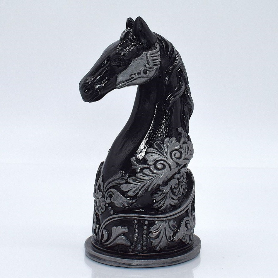 В его форме не просто красота, а кинетическая энергия, вот-вот готовая вырваться наружу. Его цвет - глубокий чёрный, как уголь под пеплом. И на этой тёмной основе не просто серебряный декор, а прожилки холодного пламени. Античное серебро лат и сложного орнамента бегущего по мощному торсу мерцают сдержанным благородством.